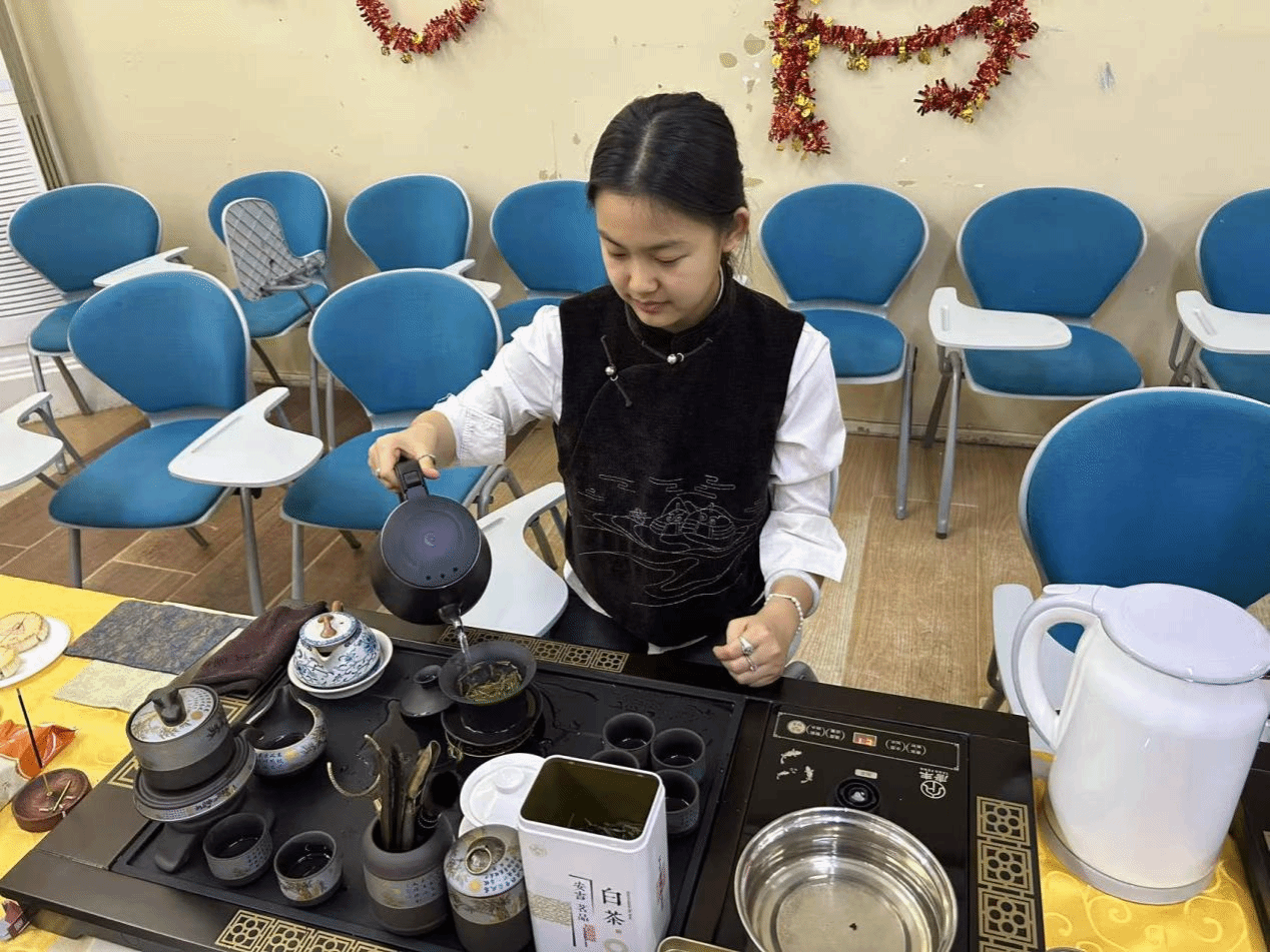 在志愿者教师张雨萌的讲解下,同学们了解中国茶的历史渊源、礼仪文化与不同茶类功效,学习品茗方式与待客之道。一盏清茶之间,体会“和、敬、清、雅”的东方文化精神。茶香袅袅,友谊悄然升温。